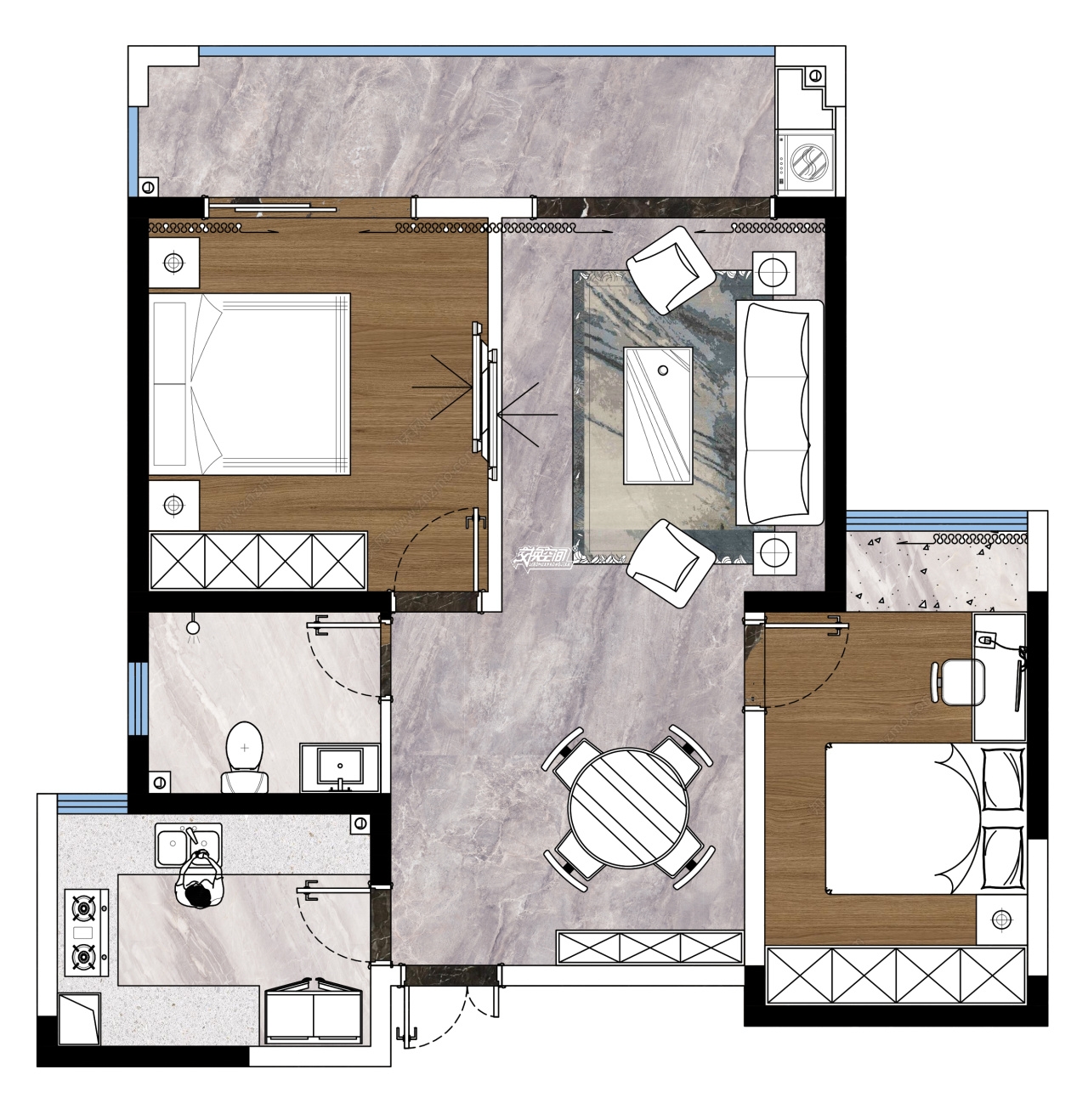 根據(jù)客戶對(duì)家的定義和需求,本案選用現(xiàn)代極簡(jiǎn)灰為主調(diào),體現(xiàn)都市青年在經(jīng)歷喧囂繁華后,回歸理性主義的生活態(tài)度,同時(shí)融入年輕時(shí)尚的潮流元素。